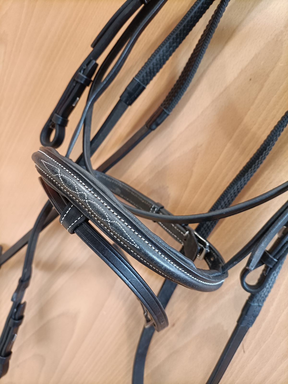 Comprar Cabezada de montar de cuero, con riendas de goma, con cierrabocas, color negro, talla COB por 54,00€. Producto no disponible, recogida en tienda.