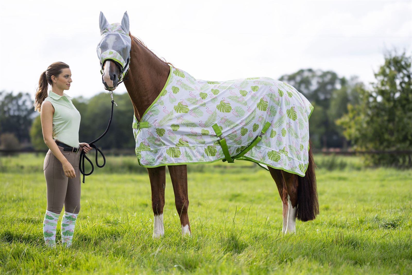 Comprar Máscara antimoscas HKM con orejas Flamingo estampado hojas y flamencos TALLA COB con 15,00% de descuento por 16,96€ (antes 19,95€). Producto en stock, recogida en tienda.