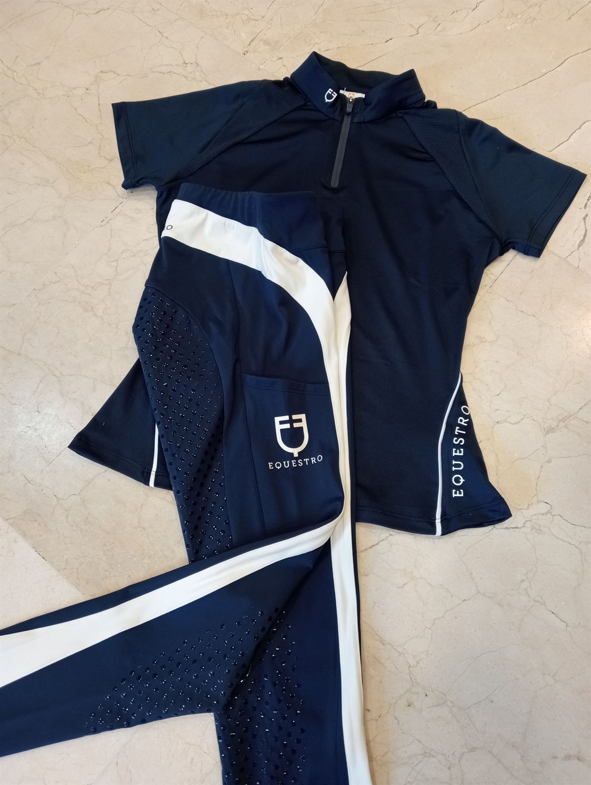 Logotipo de Equestro estampado en el lado derecho del cuello y letras de Equestro en el lateral.