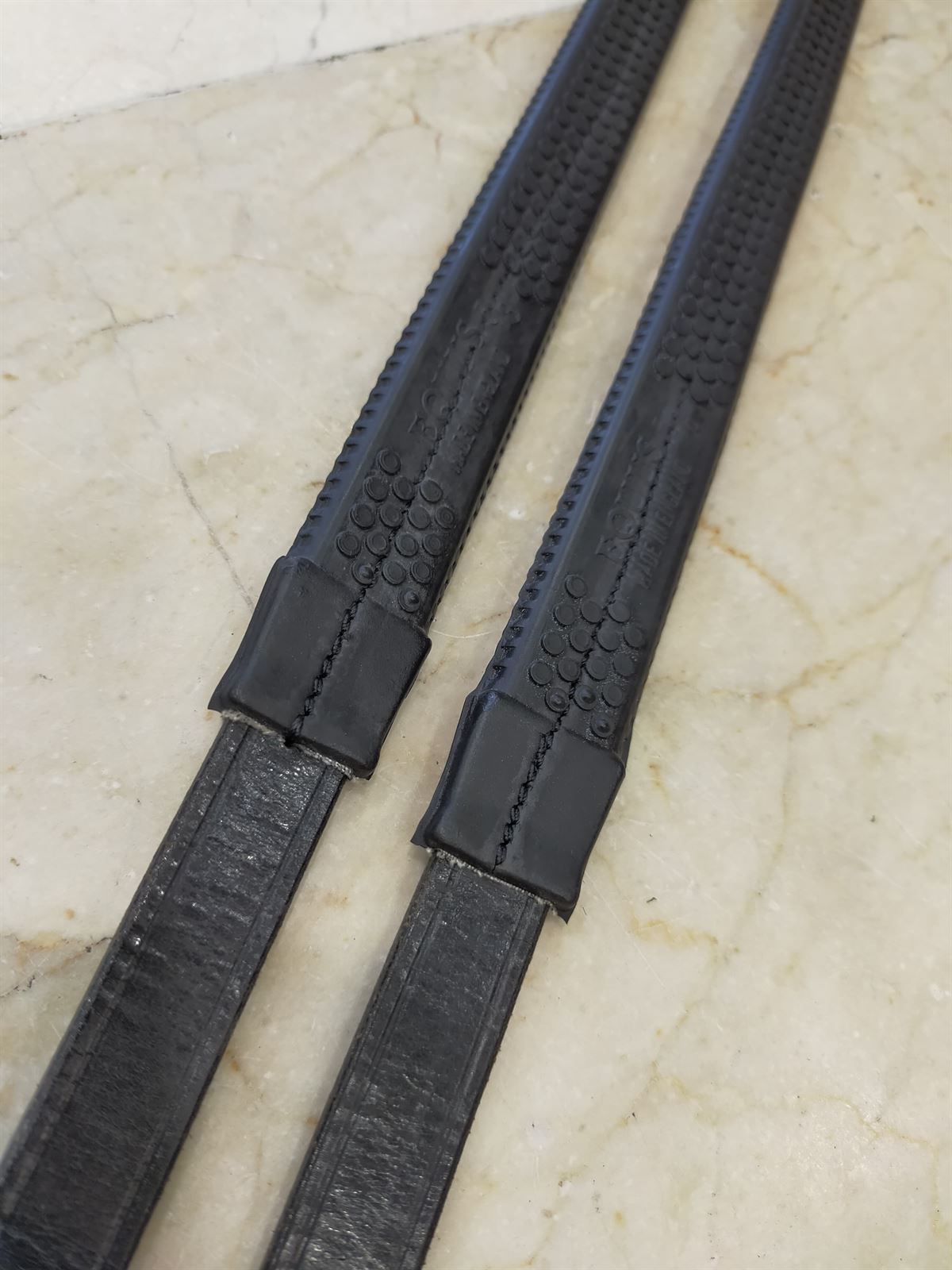 Riendas LUDOMAR, en goma negra (Equus made en England) y cuero negro de excelente calidad, fabricación nacional. Calidad alta. Hebillas inox.
